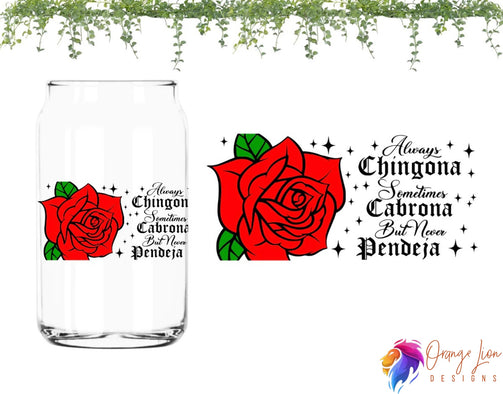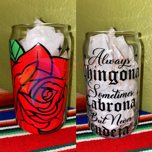 Introducing Always Chingona - the perfect cup for all Latina powerhouses! With a clear design and rose accent, this cup proudly boasts the empowering phrases "always chingona, sometimes cabrona, never pendeja”. Show off your strong mujer energy with a cup that speaks for itself. ¡Dale, siempre chingona!