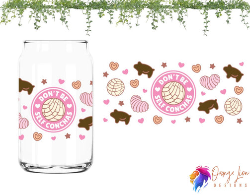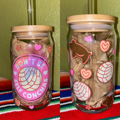 Indulge in our "Don't Be Self Conchas" clear cup, featuring a pink design adorned with hearts and the delicious charm of pan dulce. No need to take yourself too seriously with this cheeky and playful addition to your kitchenware collection.