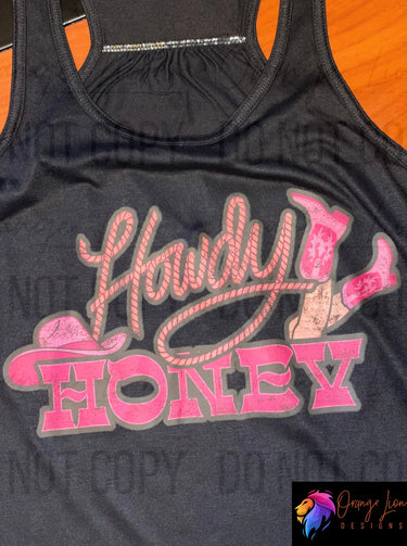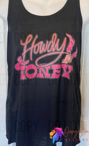 Introducing the Howdy Honey tank top, perfect for country adventures! With its stylish pink design and cowboy hat graphic, you'll be ready to lasso some fun. Plus, the rope accents and boot print add some extra flair. Giddy up!