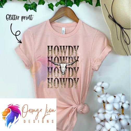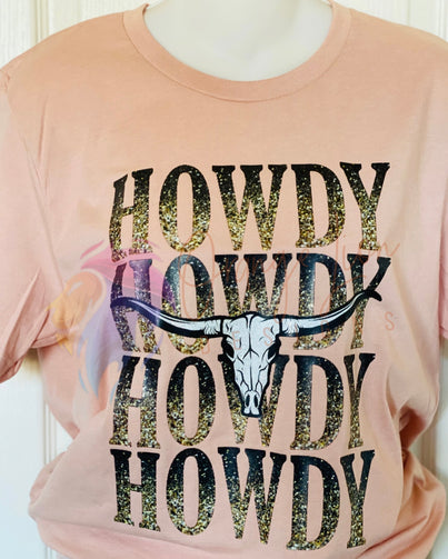 Saddle up with the Howdy Stacked tee! This country-inspired tee boasts a glittery bull skull design, perfect for adding a touch of glam to your everyday outfit. Embrace your inner cowgirl and show off your unique style with this playful and quirky tee. Giddy up!