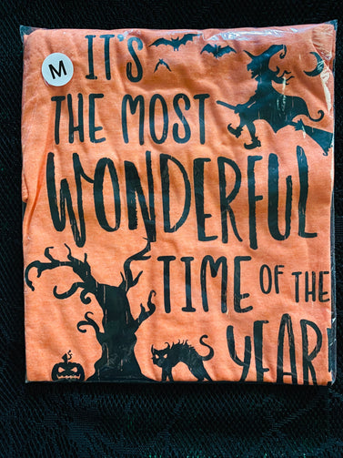 Tis the season for this spooktacular tee! Featuring a wicked witch, black cat, pumpkin, and haunted tree design, this Halloween-inspired shirt is perfect for getting in the spirit (pun intended). It's the most wonderful time of the year to embrace your spooky side!